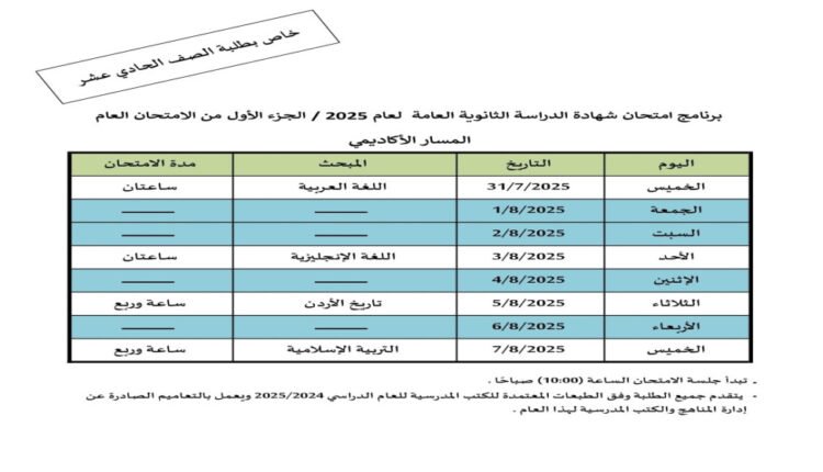 إعلان جدول امتحانات شهادة الدراسة الثانوية لطلبة الصف الحادي عشر