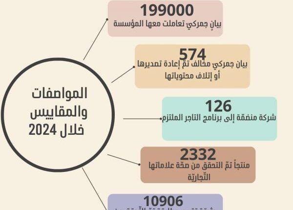 أعلنت مؤسسة المواصفات والمقاييس أنها تعاملت خلال العام الماضي مع (199) ألف بيانٍ جمركيّ عبر مختلف المعابر والمنافذ الجمركيّة، وذلك ضمن جهودها في الرّقابة والتفتيش والتأكد من مطابقة السّلع والمنتجات المستوردة للمواصفات قبل السّماح بدخولها إلى البلاد وتداولها في الأسواق.