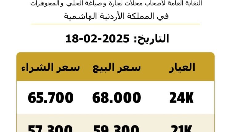 وبلغ سعر غرام الذهب من عيار 21 الأكثر طلبا من المواطنين 59.3 دينارا لغايات البيع من محلات الصاغة، مقابل 57.3 دينارا لجهة الشراء.