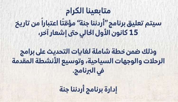 وفي التفاصيل نشرت الوزارة على منصاتها، بأنه سيتم تعليق برنامج “أردننا جنة” مؤقتًا اعتبارا من تاريخ 15 كانون الأول الحالي حتى إشعار آخر، وذلك ضمن خطة شاملة لغايات التحديث على برامج الرحلات والوجهات السياحية، وتوسيع الأنشطة المقدمة في البرنامج.